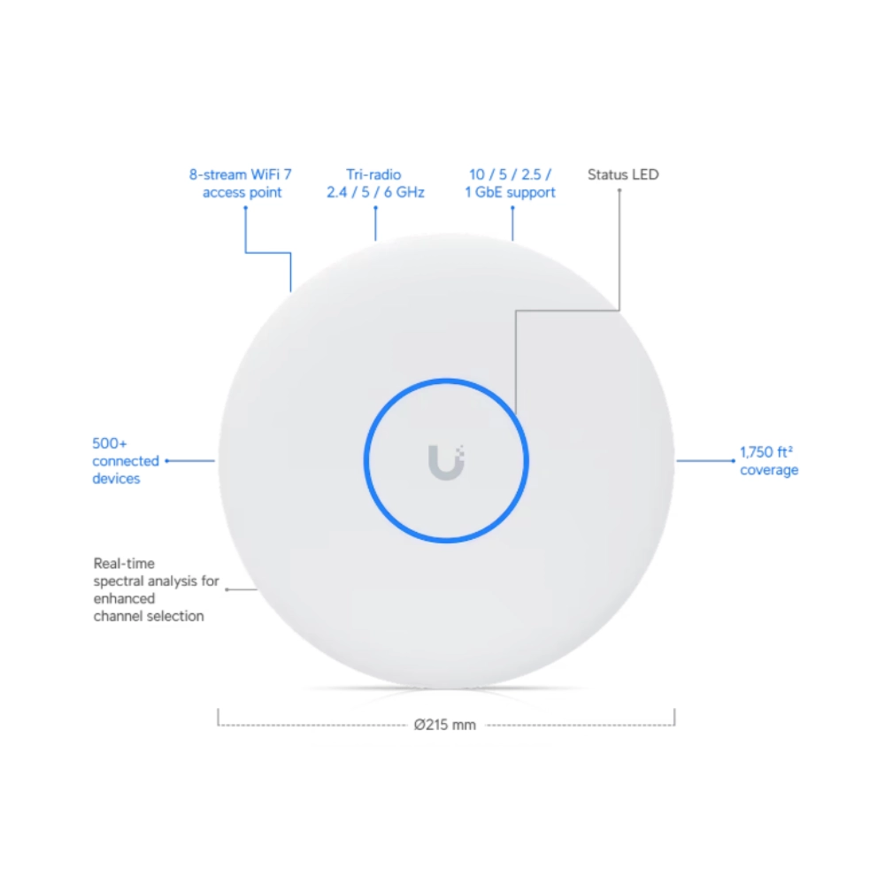 Unifi U7 Pro XGS hỗ trợ Wi-Fi 7 (802.11be), cung cấp tốc độ kết nối vượt trội và băng thông rộng hơn so với các chuẩn Wi-Fi trước đó.