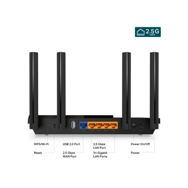 TP-Link AX55 Pro sở hữu cổng kết nối đa dạng với 1× cổng 2.5 Gbps WAN/LAN và 1× cổng 1 Gbps WAN/LAN, đảm bảo đường truyền băng thông lớn cho modem và thiết bị kết nối. Thiết bị còn có 3 cổng LAN Gigabit, hoàn hảo cho máy tính, TV thông minh hoặc máy chơi game. Cùng với cổng USB 3.0 giúp dễ dàng chia sẻ dữ liệu qua ổ cứng và máy in thông qua mạng.