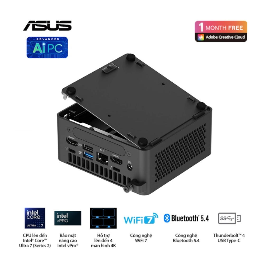 Với thiết kế siêu mỏng (chỉ 37mm cao) và kích thước nhỏ gọn (117 mm x 112 mm), Asus Mini PC NUC 15 Pro Slim rất dễ dàng lắp đặt trong bất kỳ không gian nào, đồng thời mang lại khả năng mở rộng linh hoạt thông qua các cổng kết nối như USB 3.2, USB-C, HDMI, và hỗ trợ Wi-Fi 7. Đặc biệt, máy còn trang bị tính năng kết nối mạng LAN 2.5G và Bluetooth 5.2, giúp bạn kết nối nhanh chóng và ổn định với các thiết bị mạng và ngoại vi.