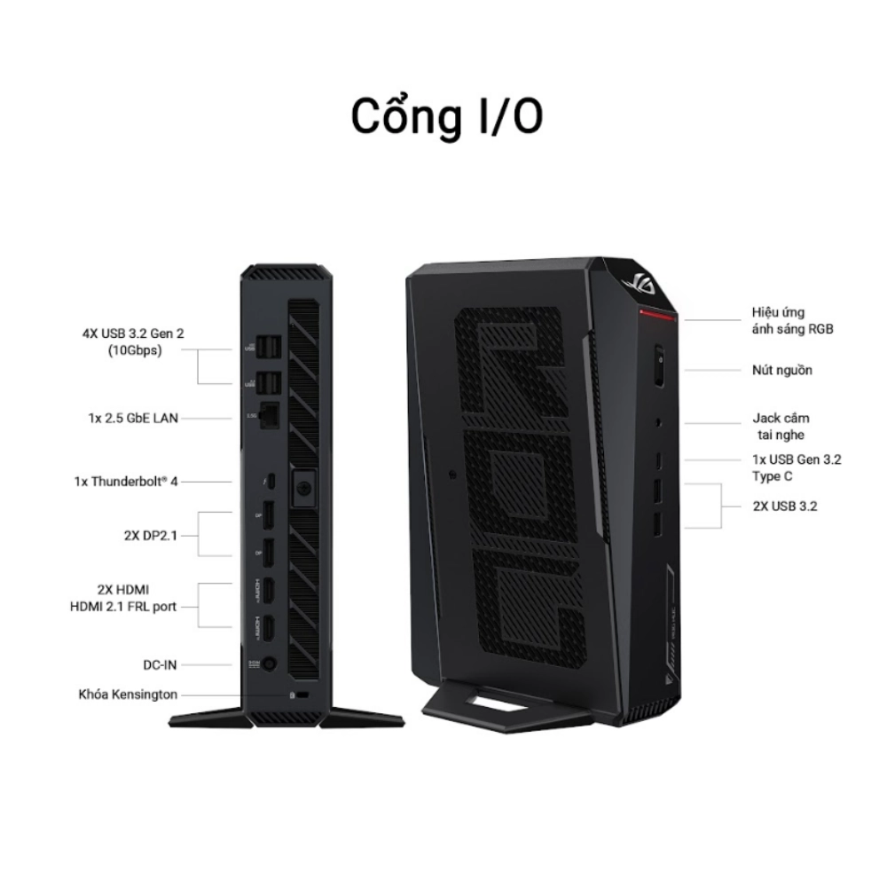 Asus Mini PC ROG NUC RNUC15JNK7X569A0 cung cấp nhiều cổng kết nối đa dạng như 2 x USB 3.2 Gen2 Type-A, 1 x USB 3.2 Gen2 Type-C, và 1 x Thunderbolt™ 4 Type-C, hỗ trợ kết nối nhanh chóng và mở rộng với các thiết bị ngoại vi. Cổng USB Type-C hỗ trợ DisplayPort™ 2.1, cho phép bạn kết nối với các màn hình ngoài để mở rộng không gian làm việc hoặc chơi game với độ phân giải cao.