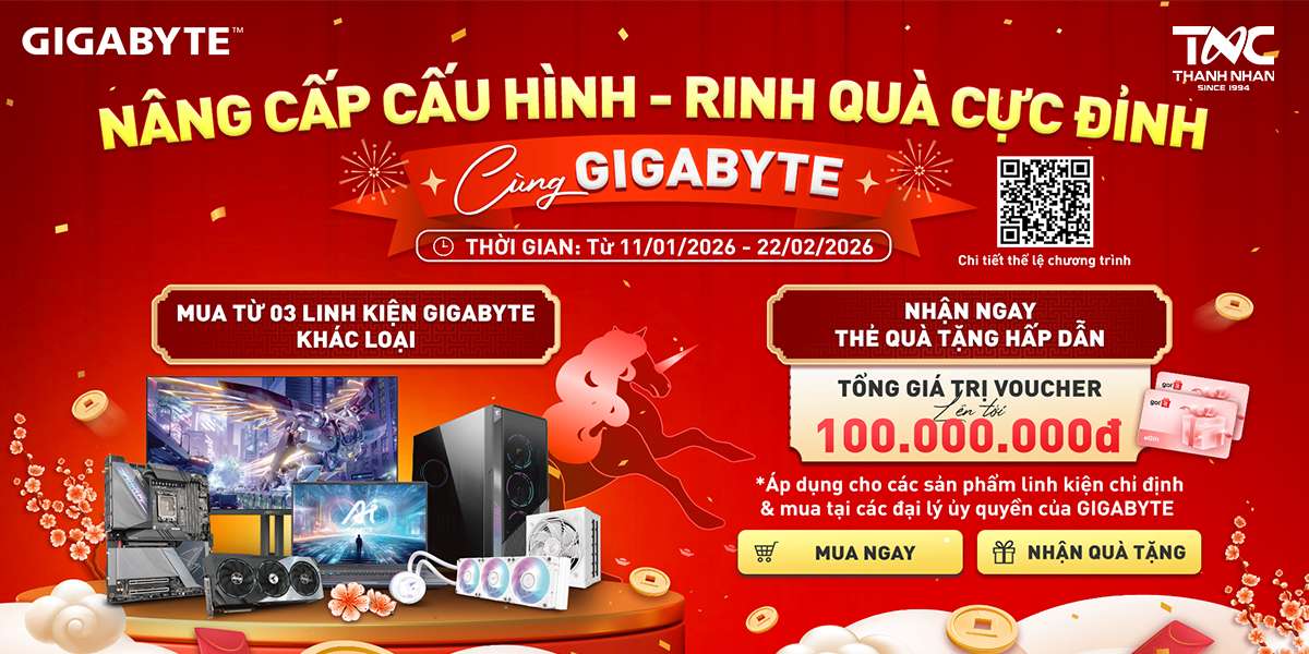 Đầu năm là thời điểm lý tưởng để nâng cấp dàn PC nhằm tăng hiệu năng, tối ưu trải nghiệm làm việc – giải trí và sẵn sàng cho mọi tựa game/đồ họa. Thành Nhân TNC phối hợp cùng GIGABYTE triển khai chương trình ưu đãi dành cho khách hàng mua linh kiện GIGABYTE chính hãng tại Thành Nhân TNC, giúp bạn vừa lên cấu hình mạnh hơn vừa nhận quà tặng giá trị.